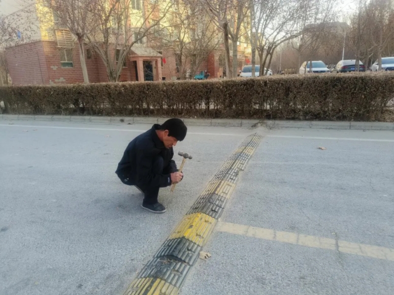 该小区主干道连接着周边居民区、机关小广场与商业区,是居民上下班、学生上下学的必经之路,每日车流量、人流量居高不下,交通安全保障任务艰巨。此前,社区为规范车辆通行秩序、降低事故风险安装的减速带,因长期经受车辆碾压、风吹日晒,部分出现橡胶开裂、螺丝松动、局部脱落等破损情况。时值冬季,路面易结冰打滑,破损减速带不仅无法发挥减速缓冲作用,甚至可能因凸起、松动对非机动车和行人造成刮蹭风险,给过往职工群众带来极大安全隐患。