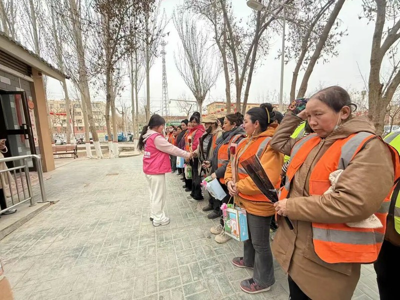 节日的温情,从未止步于会场。下午,妇联工作人员带着慰问品与诚挚祝福,走向街头巷尾,看望坚守在环卫一线的女环卫工人。她们身着工装,日复一日用扫帚丈量街道,用汗水洁净家园,是团场最美的“美容师”,也是最坚韧的巾帼力量。慰问组与她们亲切交谈,细致询问工作生活情况,感谢她们不畏辛劳、坚守一线,为团场环境整洁付出的点滴努力,并将满载关怀的慰问品送到她们手中。一句句暖心的话语,一份份实在的关怀,让一线环卫女工们笑容满面,真切感受到了团场大家庭的温暖。