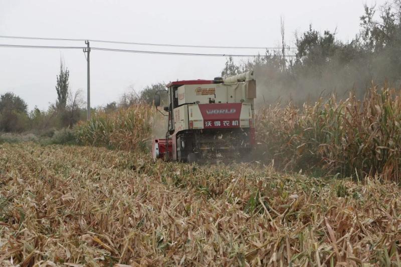 走进四十九团九连职工吐拉洪·吾斯曼的玉米地,玉米收割机如同“钢铁卫士”,在金黄色的田垄间来回穿梭,收割机所到之处,玉米秸秆被精准切断,果穗经输送装置进入机身内部,脱粒、装车一系列工序井然有序,而处理后的秸秆则被粉碎还田,实现了资源的循环利用。机械轰鸣声奏响了“丰收序曲”。