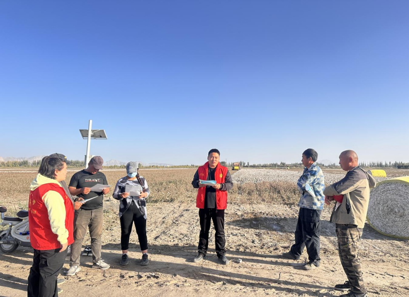 宣传引导环节,四十九团十连党支部通过“线上+线下”双渠道开展安全知识普及。线上依托微信群实时转发采棉机械操作规范、火灾应急处置方法等安全要点,确保职工群众随时可学;线下组织“两委”“访惠聚”工作队、党员在采棉现场开展安全讲解,手把手演示应急操作,并发放安全手册100余份,将安全知识送到职工群众手中。
