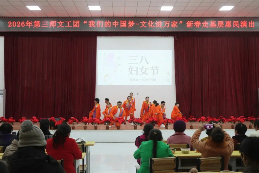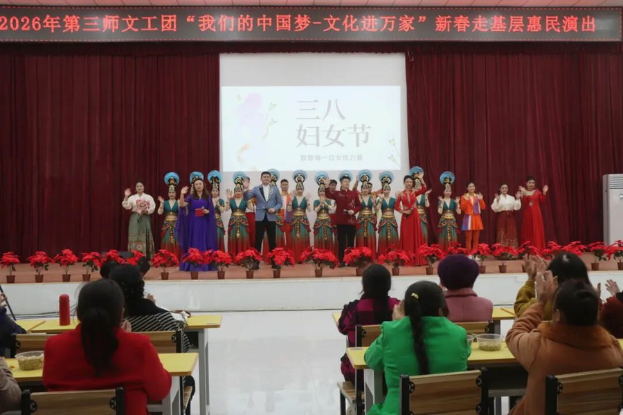 为深入实施文化润疆工程,丰富团场职工群众精神文化生活,大力弘扬中华优秀传统文化,铸牢中华民族共同体意识,近日,第三师文工团走进四十九团,开展 2026 年“我们的中国梦—— 文化进万家”走基层惠民演出。一场场精彩纷呈、暖意融融的文化盛宴,让职工群众在家门口尽享艺术熏陶,让文化春风吹遍团场大地。