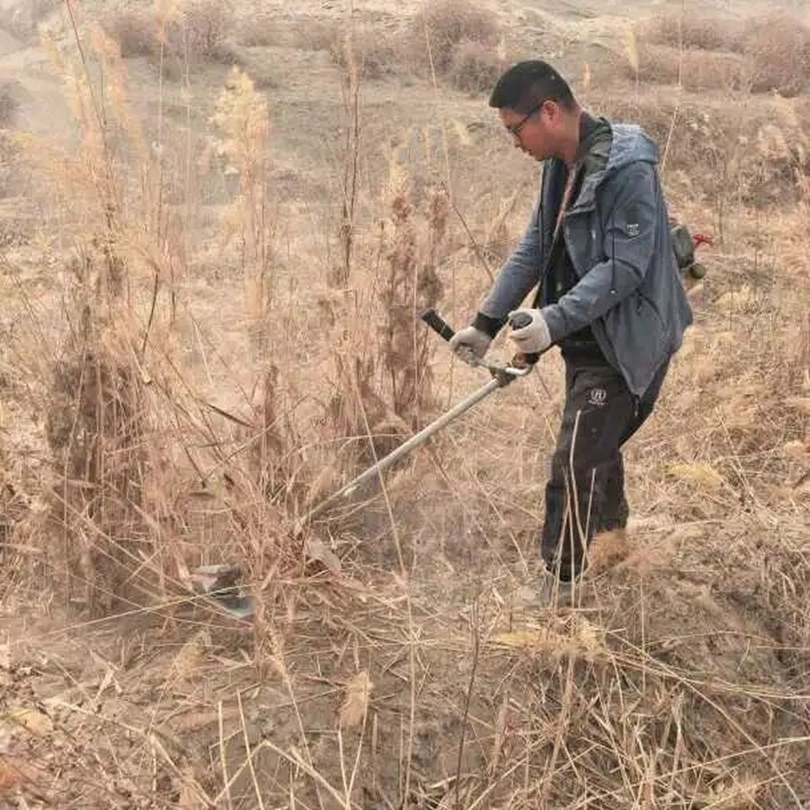 清理现场,职工们分工协作、干劲十足。大家手持割草机、铁锹、筢子等工具,深入退化林区域,对缠绕林木的枯黄杂草、白色垃圾进行全面清理。