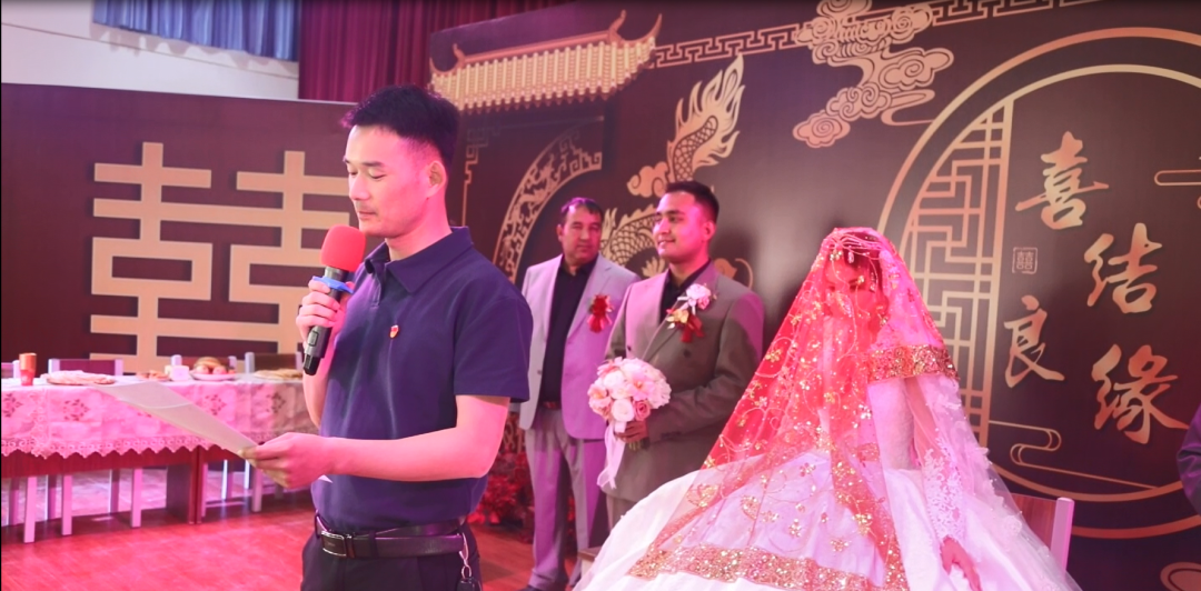 婚礼现场,新娘身穿婚纱、新郎身着西装礼服,在亲友祝福中踩着红毯走向彼此,传统音乐与现代喜庆乐曲交替响起,宾客们围坐一堂,既显中华传统文化魅力,又融入少数民族热情特色,仪式庄重又温馨。作为证婚人,五十团平安法治建设办公室主任邓健也向新人提出了殷切期望。