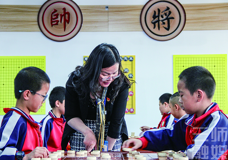 图为 周帅群指导学生下象棋,感受中华传统文化的魅力。