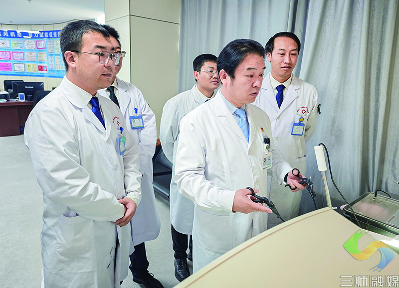 在“练文勇工作室”,练文勇正带着几名年轻医生通过腔镜练习钳抓取物,在模拟器上练习多种器械操作及相关手术演练,将术中常见的问题及相应处理方法进行详细解释。通过手把手指导,年轻医生亲自上手操作时很快能理解要领,反复练习,锻炼空间感认知度,提高在临床腔镜操作上的效率和精准度。