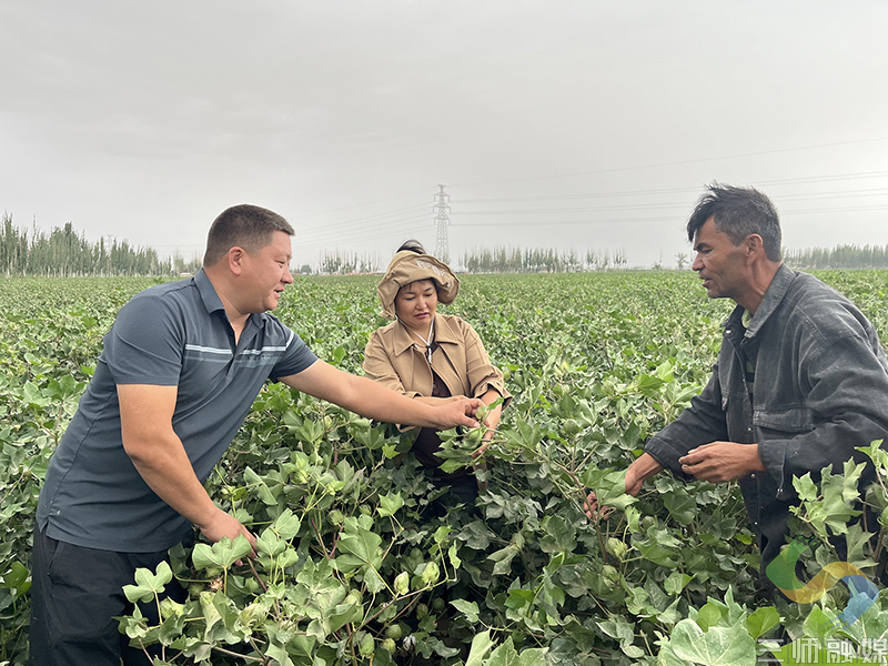 图为 买吾拉·阿不都威力(右一)为种植户讲解棉花管理技巧。