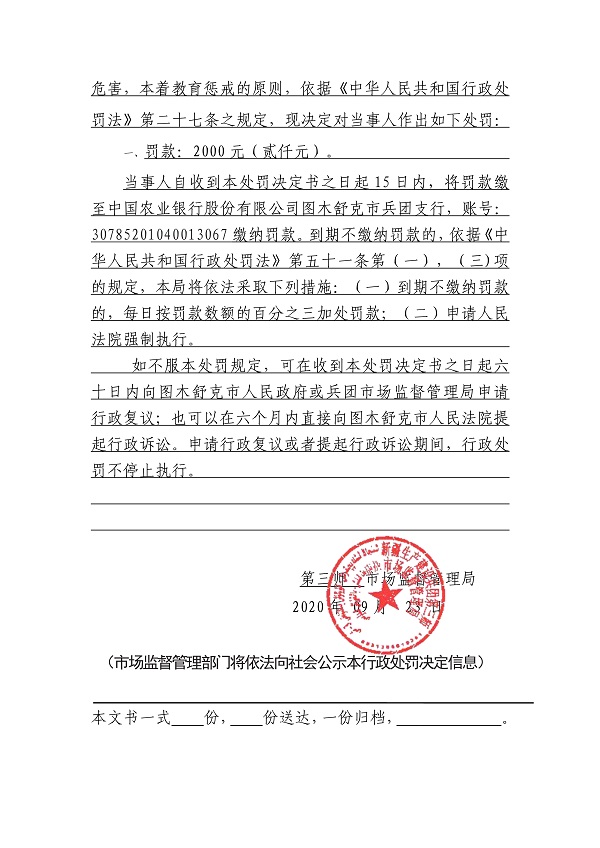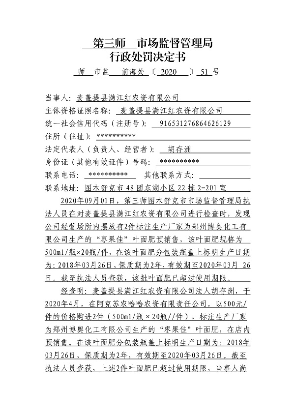 关于麦盖提县满江红农资有限公司销售失效、变质产品案行政处罚决定的公示