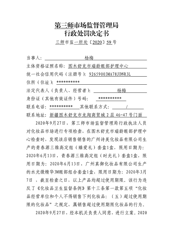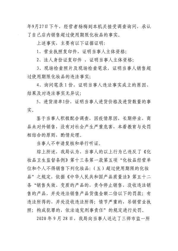 关于杨梅销售超过使用期限化妆品案行政处罚决定的公示