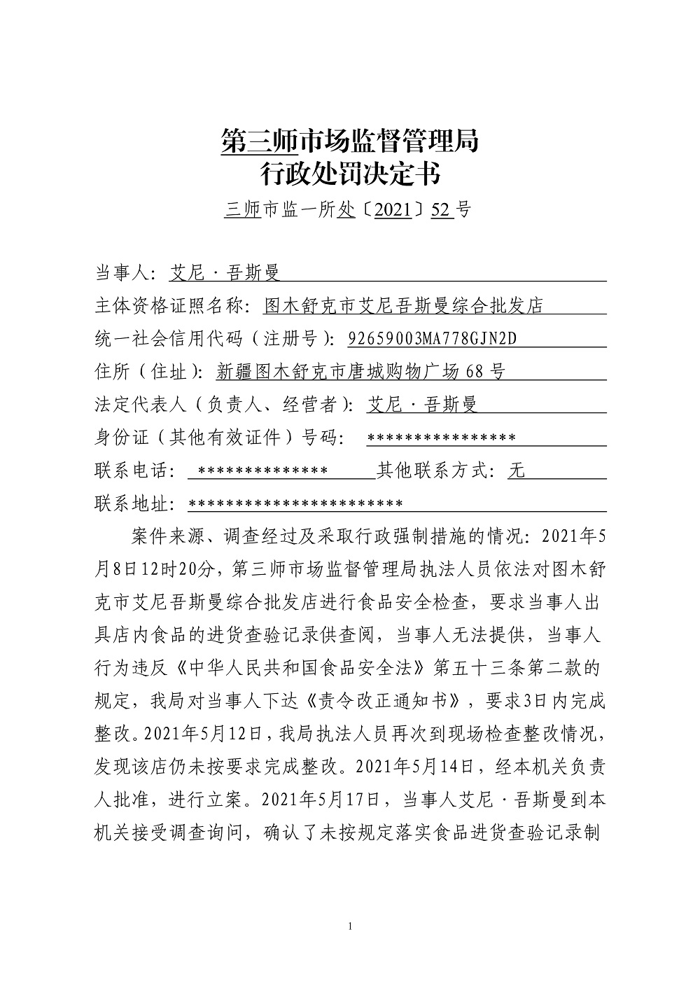 艾尼•吾斯曼未按规定落实食品进货查验记录制度案〔2021〕-52