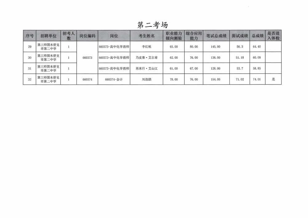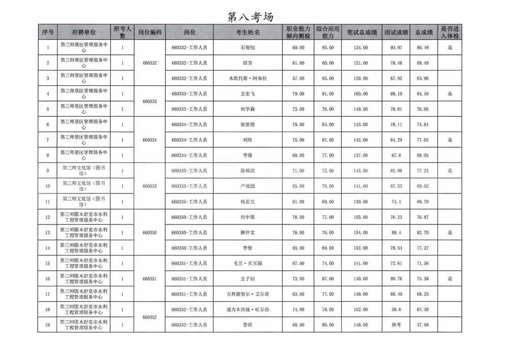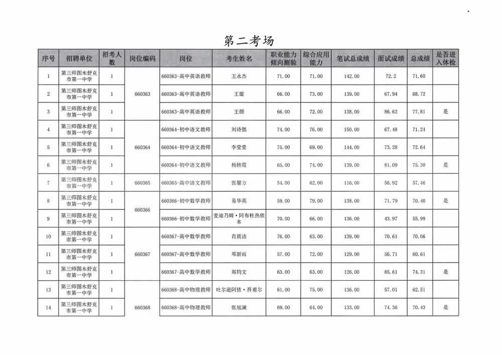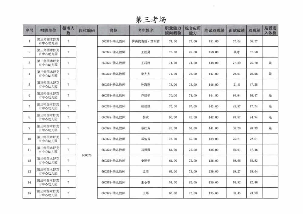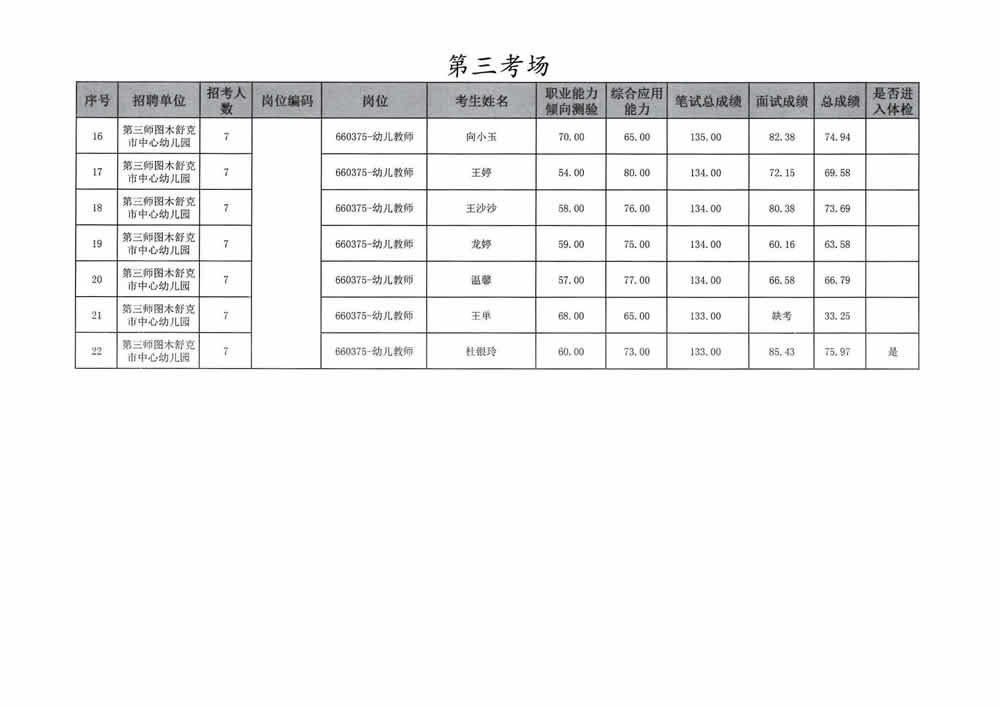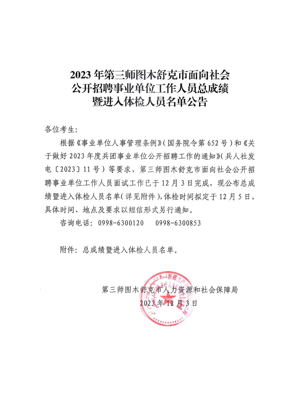 2023年第三师图木舒克市面向社会公开招聘事业单位工作人员总成绩暨进入体检人员名单公告
