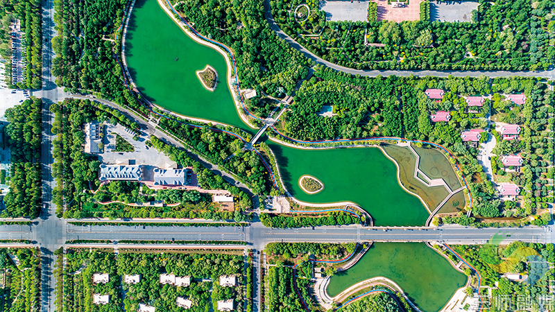 图为 航拍的图木舒克市南北湖,盈盈绿水穿城过。(资料图片)