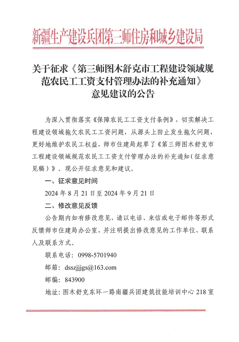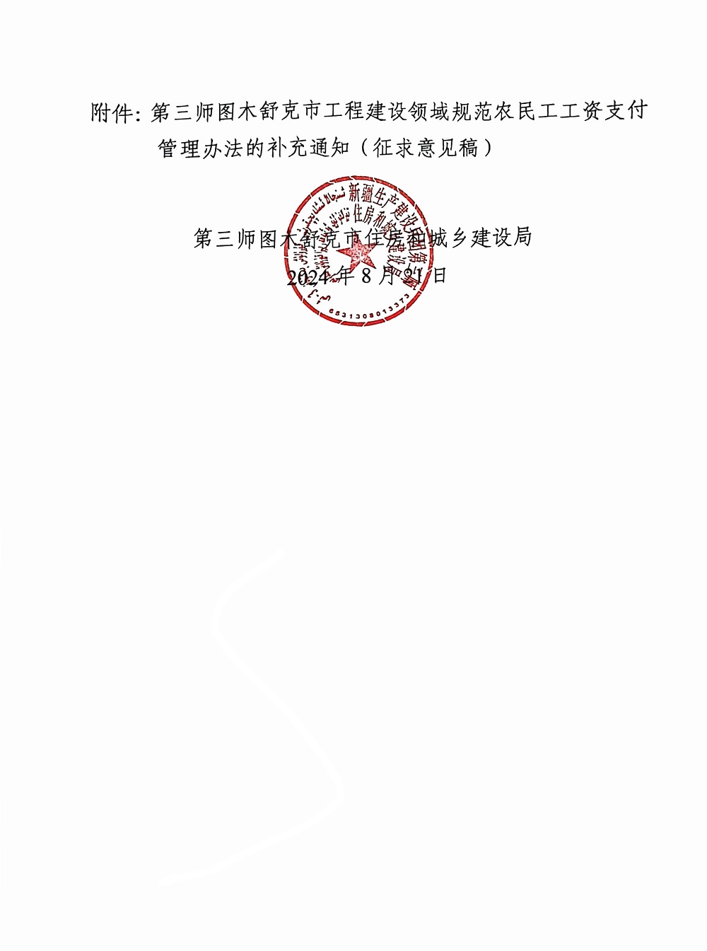 关于征求《第三师图木舒克市工程建设领域规范农民工工资支付管理办法的补充通知》意见建议的公告