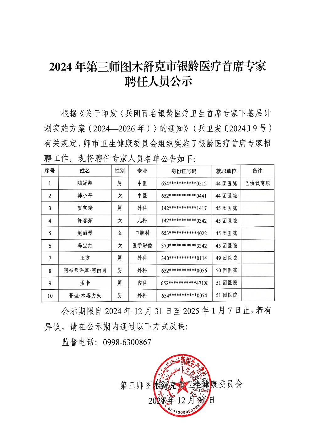 2024年第三师图木舒克市银龄医疗首席专家聘任人员公示