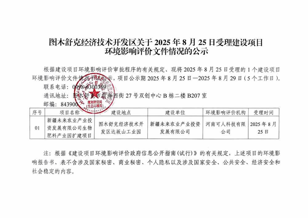 图木舒克经济技术开发区关于2025年8月25日受理建设项目环境影响评价文件情况的公示