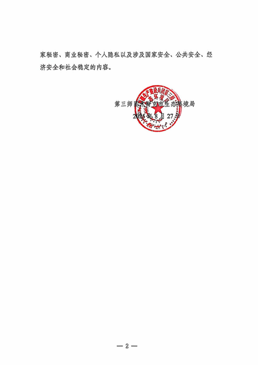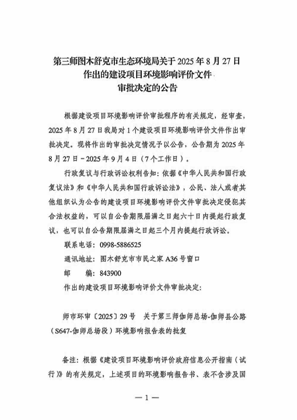 第三师图木舒克市生态环境局关于2025年8月27日作出的建设项目环境影响评价文件审批决定的公告