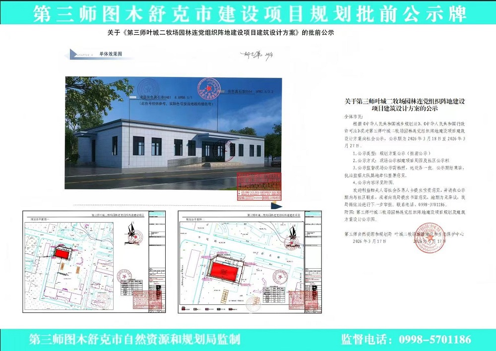 关于《第三师叶城二牧场园林连党组织阵地建设项目建筑设计方案》的批前公示