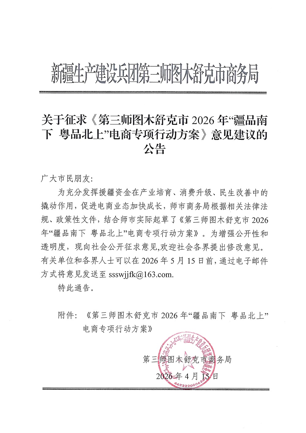 附件:《第三师图木舒克市2026年“疆品南下 粤品北上”电商专项行动方案》