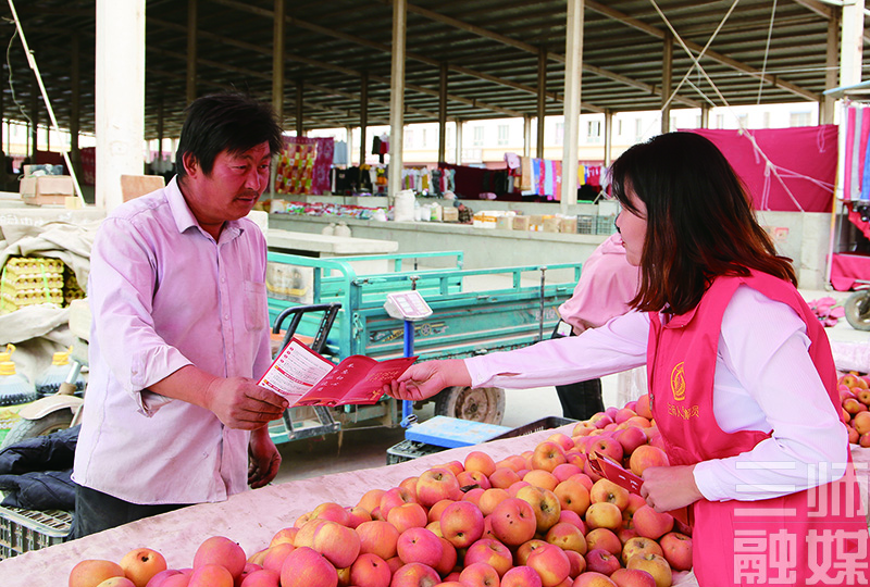 图为 四十九团海安镇普法宣传员为商贩发放宣传单。 程娟 摄
