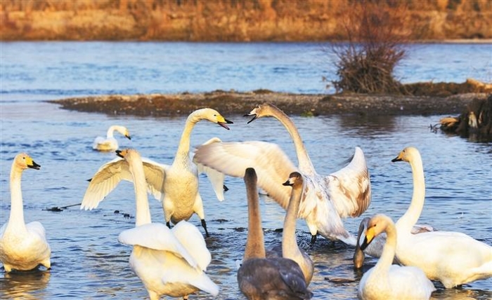 开都河二师二十一团段天鹅湾景区,成群的天鹅在此休憩(摄于11月22日)。目前,已有70多只天鹅飞临天鹅湾越冬。近年来,二十一团全面推行河长制,建立完善河湖治理体系,加强污染防治,形成人人参与、共治共享的环境保护局面。白克斌 摄