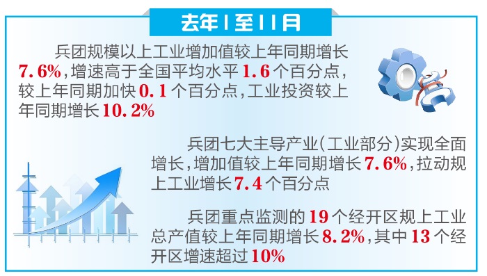 记者从兵团工业和信息化局获悉,2025年1至11月,兵团规模以上工业增加值较上年同期增长7.6%,增速高于全国平均水平1.6个百分点,较上年同期加快0.1个百分点,工业投资较上年同期增长10.2%,工业经济保持较快增长,主要指标增速位居全国前列。