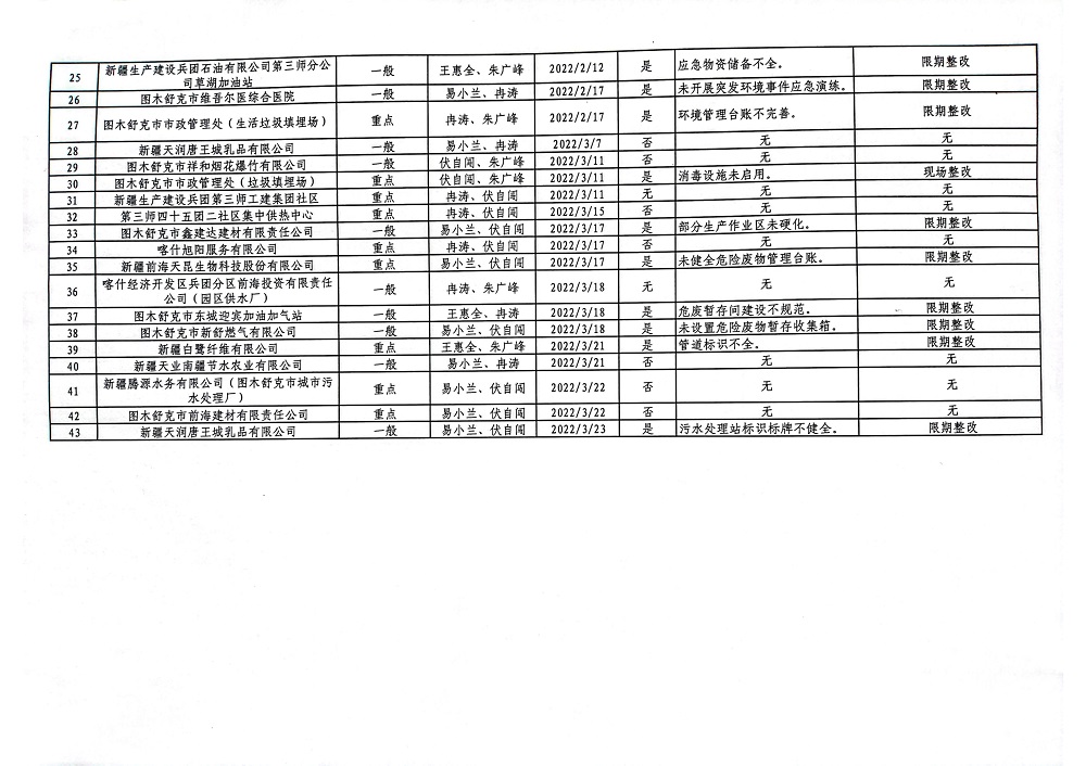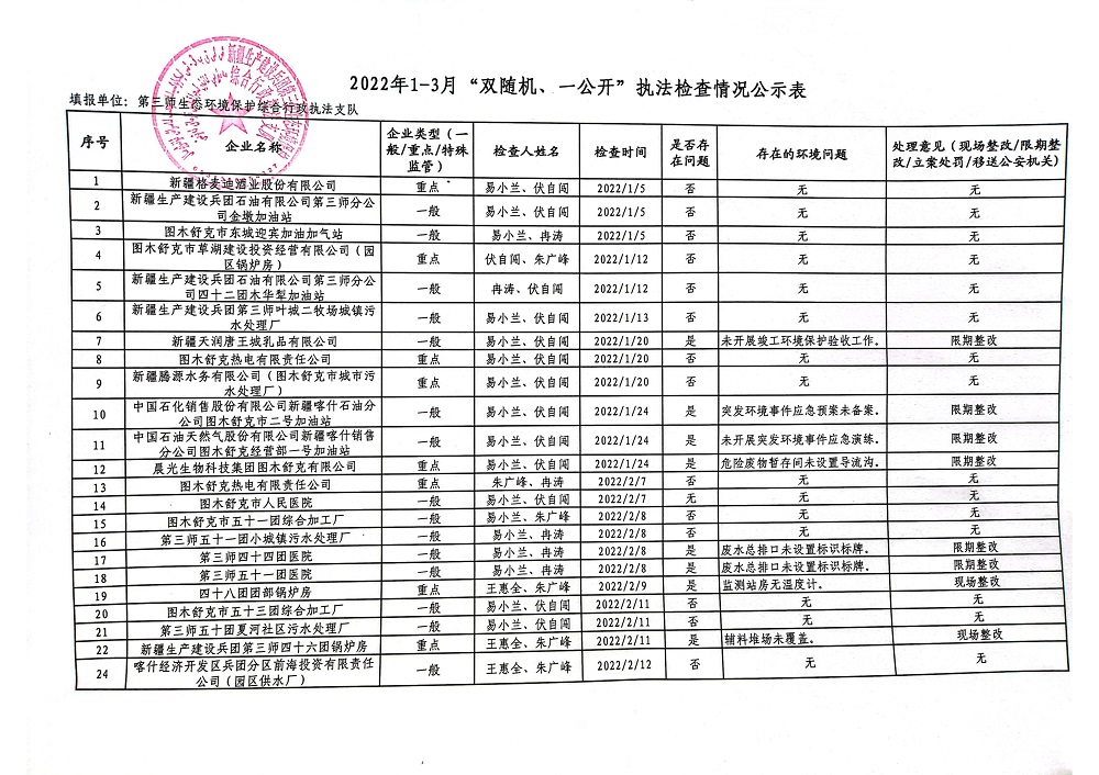 第三师生态环境保护2022年1-3月“双随机、一公开”执法检查情况公示表