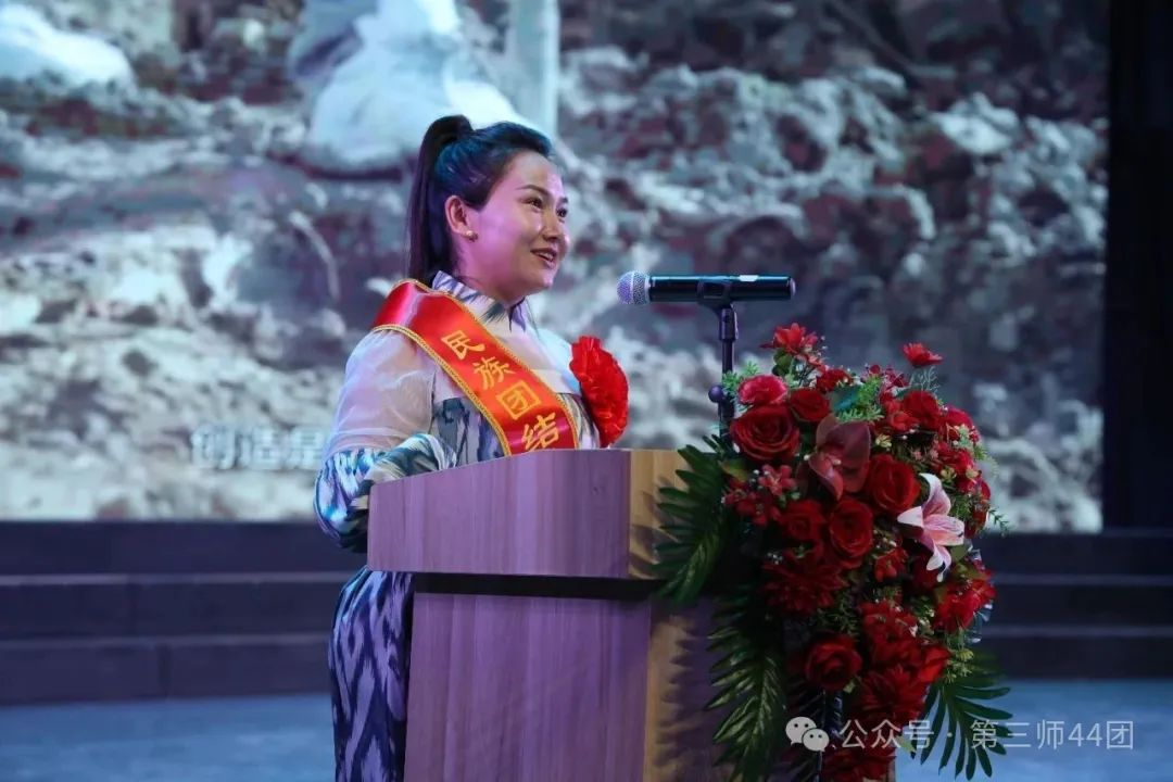 此次宣讲报告会规格高、内容实,特别邀请到全国民族团结进步模范集体代表四十九团十八连党支部书记苏永平、全国民族团结进步模范个人则温尼沙・阿布都卡地尔,以及第三师图木舒克市民族家庭代表木叶沙・吾守。他们作为民族团结进步事业的杰出践行者,为四十四团的干部群众带来了一堂生动且极具感染力的民族团结课。