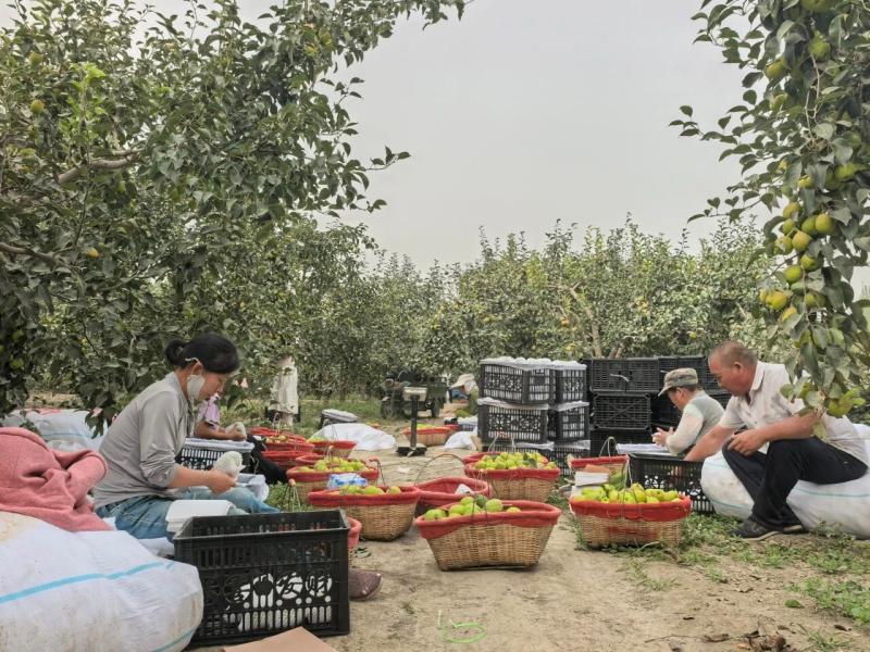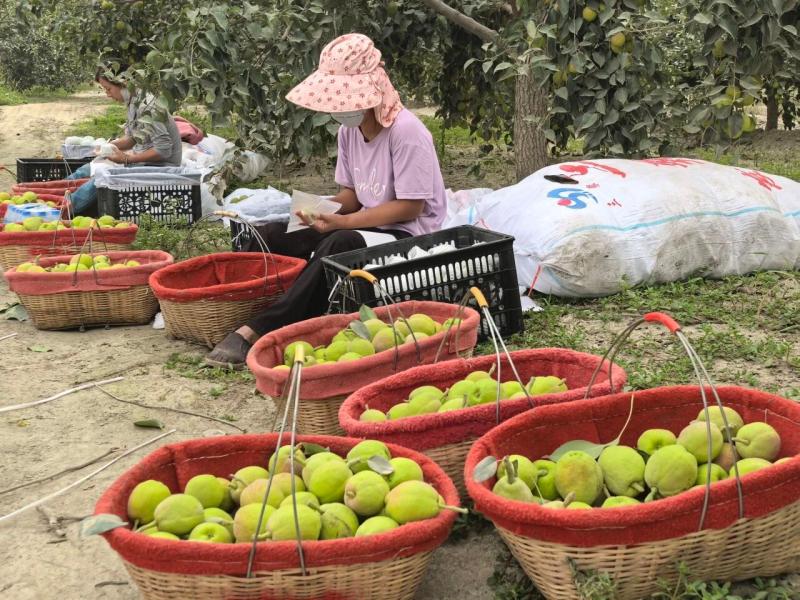 走进四十九团四连职工李道强的香梨园中,果农们正熟练地将成熟的香梨从枝头摘下,轻放于筐中,随后进行分拣、套袋、装箱等工序,现场一派繁忙而有序的景象。