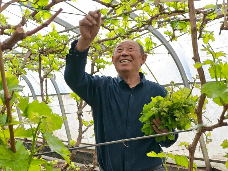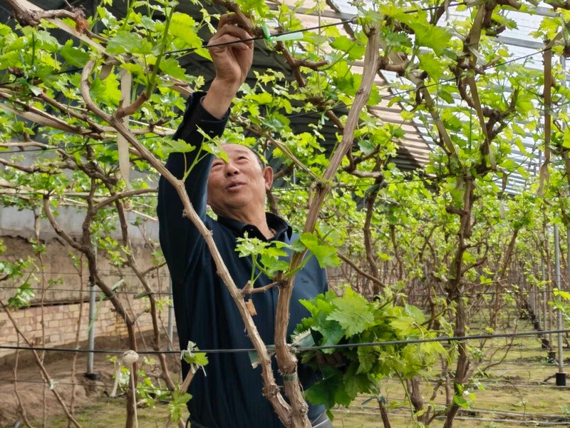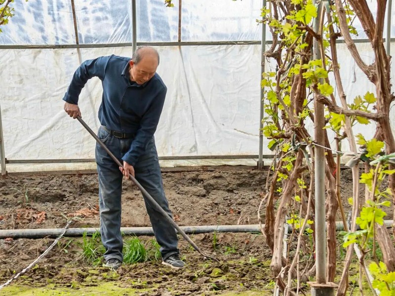 趁着土壤墒情适宜,李榜军拿起农具俯身翻土,动作轻柔且均匀,将板结的土壤疏松开来,既能促进葡萄根系呼吸,又能帮助根系更好地吸收土壤中的养分,为花穗后续膨大、坐稳果筑牢基础。除此之外,他还会定时巡查大棚,精准调控棚内温湿度,将白天棚温稳定在18-25℃、密切关注病虫害苗头,及时采取绿色防控措施,一边忙碌一边期盼,用双手呵护每一串花穗,用实干守护即将到来的丰收希望。