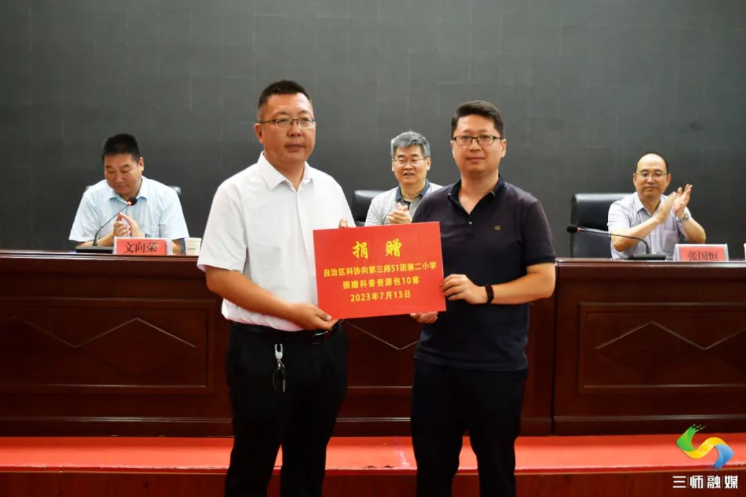 在当天举行的捐赠科普读物仪式上,西北民族大学向第三师五十一团中学捐赠170本,价值1万元的科普读物,自治区科协向第三师五十一团第二小学捐赠科普资源包10套,弘扬爱国、创新、求实、奉献、协同、育人的科学家精神。