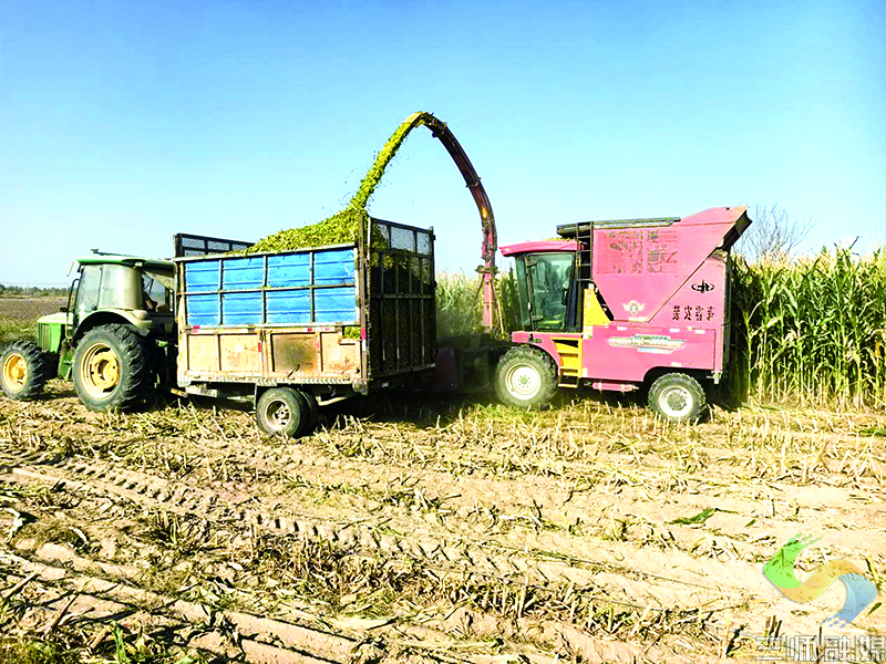 在一连种植户樊文峰的复播玉米地,伴随着阵阵轰鸣,大型青贮收割机锋利的刀片将青贮玉米整齐割断粉碎,青绿色的碎末从机身一侧源源不断地喷吐而出,运输卡车紧随身旁,车厢里垒起一座座青贮“小山”。