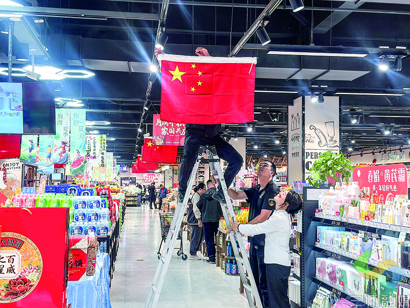 图为 9月29日,在图木舒克市一家商超内,工作人员正在悬挂国旗,喜迎国庆、中秋双节到来。 哈尼克孜·哪斯尔 摄
