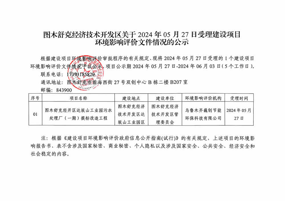 图木舒克经济技术开发区关于2024年05月27日受理建设项目环境影响评价文件情况的公示