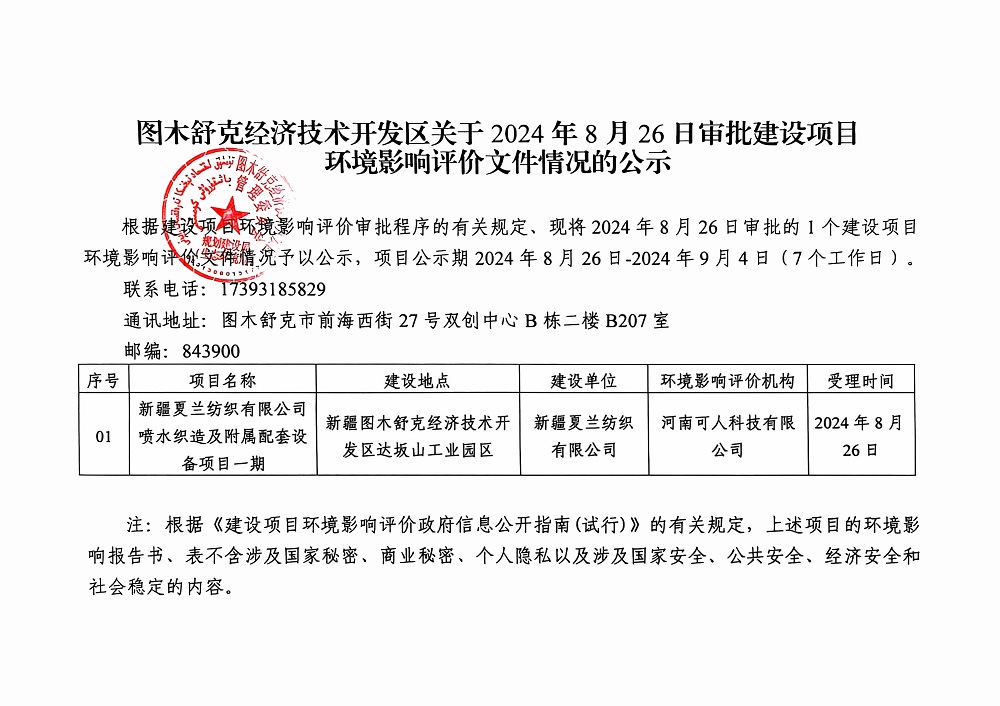 图木舒克经济技术开发区关于2024年8月26日审批建设项目环境影响评价文件情况的公示