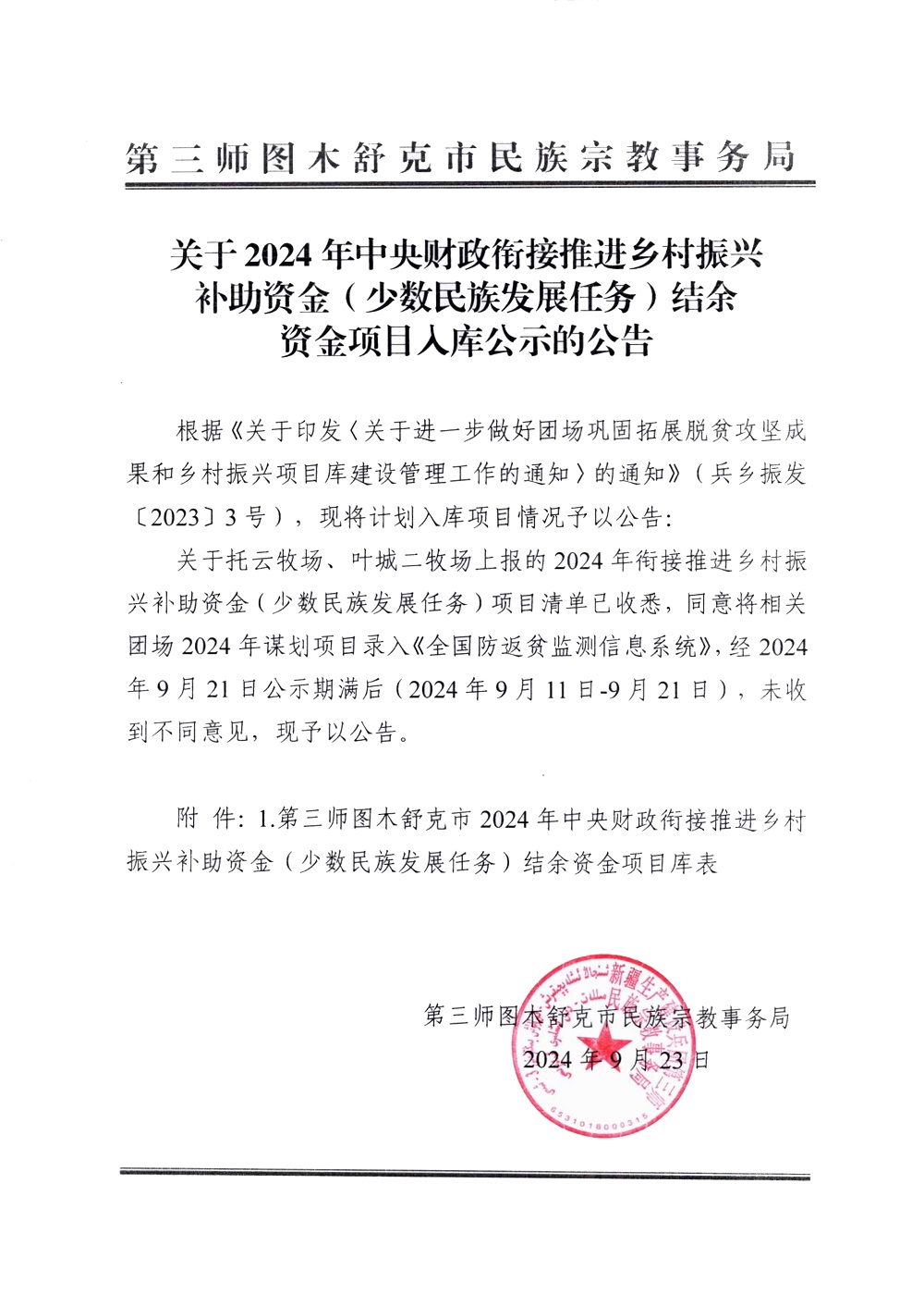 关于2024年中央财政衔接推进乡村振兴补助资金(少数民族发展任务)结余资金项目入库公示的公告