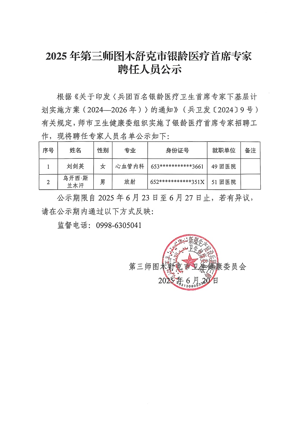 2025年第三师图木舒克市银龄医疗首席专家聘任人员公示