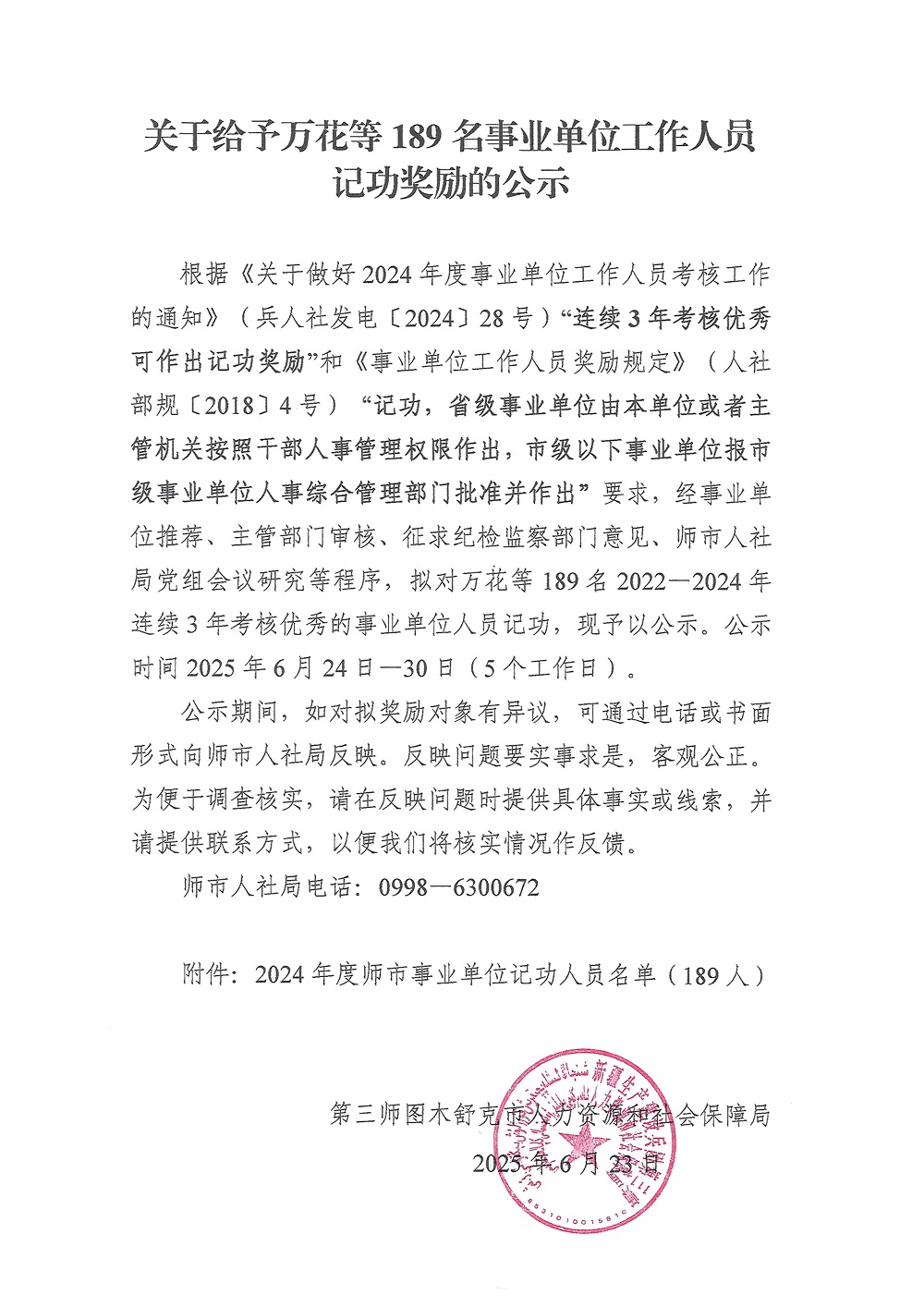关于给予万花等189名事业单位工作人员记功奖励的公示