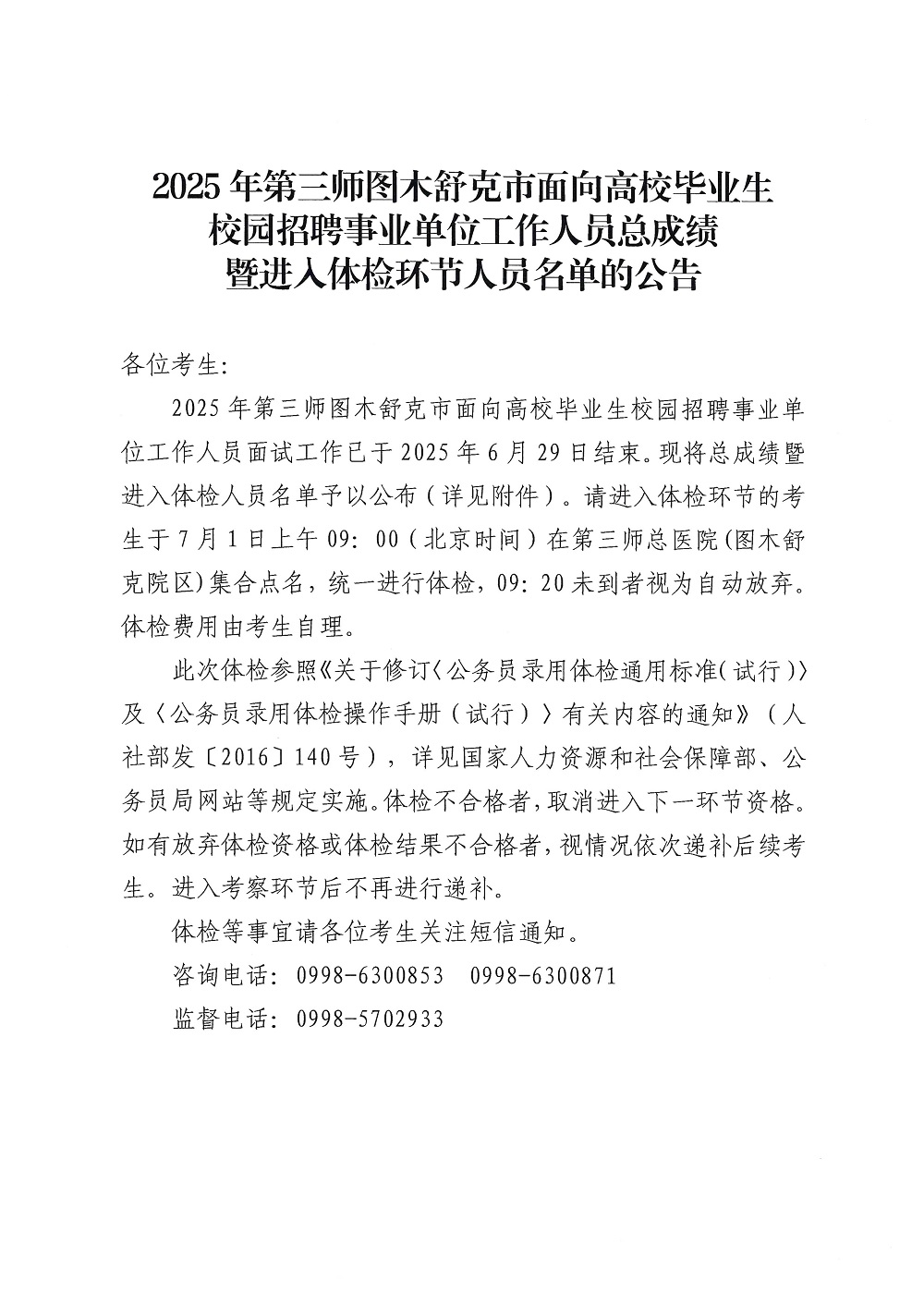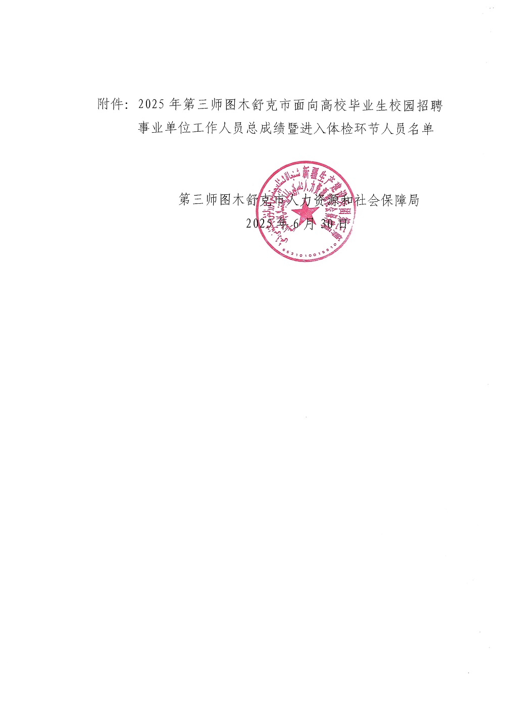 2025年第三师图木舒克市面向高校毕业生校园招聘事业单位工作人员总成绩暨进入体检环节人员名单的公告