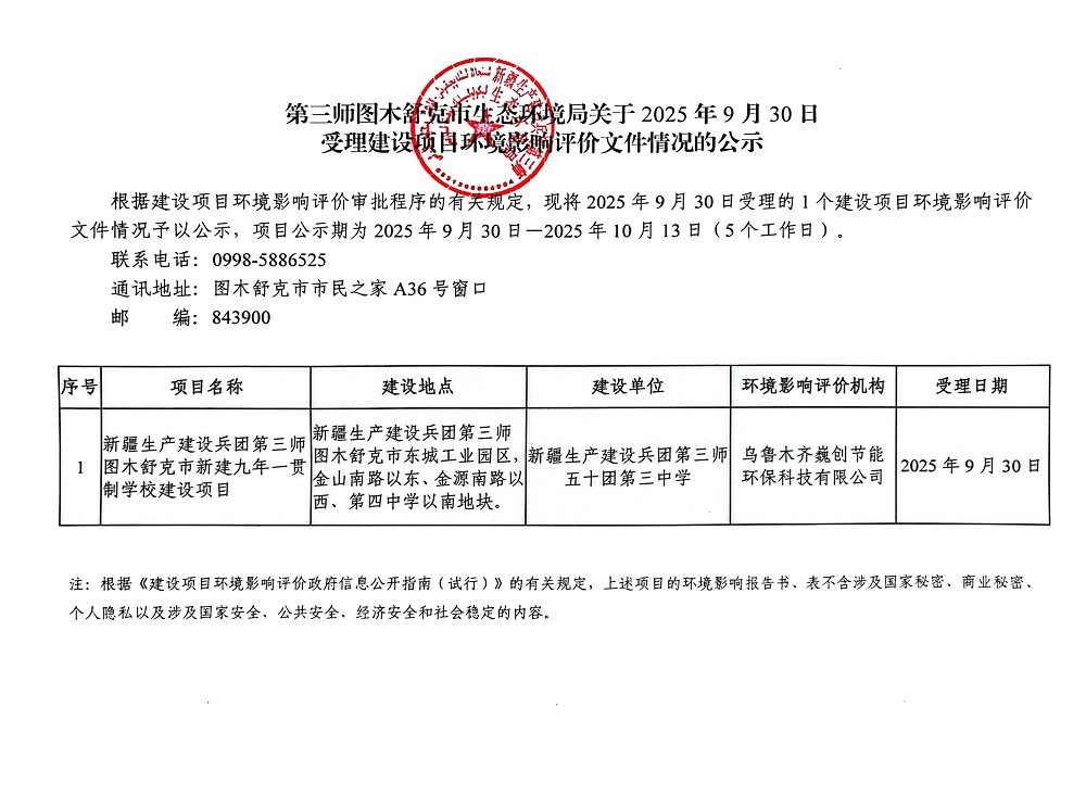 第三师生态环境局关于2025年9月30日受理建设项目环境影响评价文件情况的公示