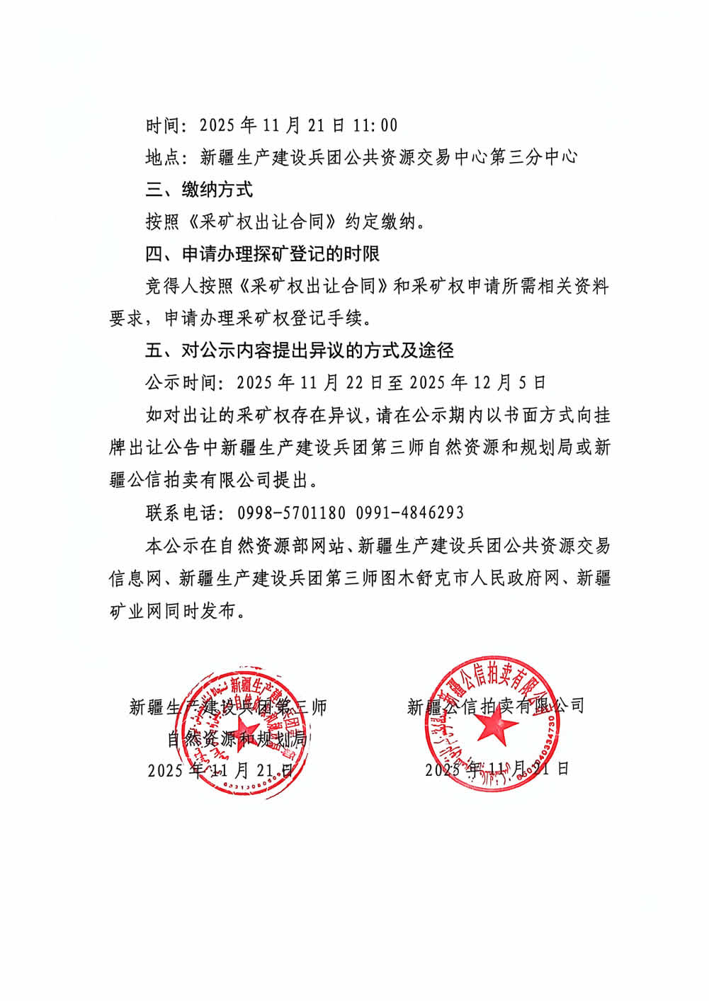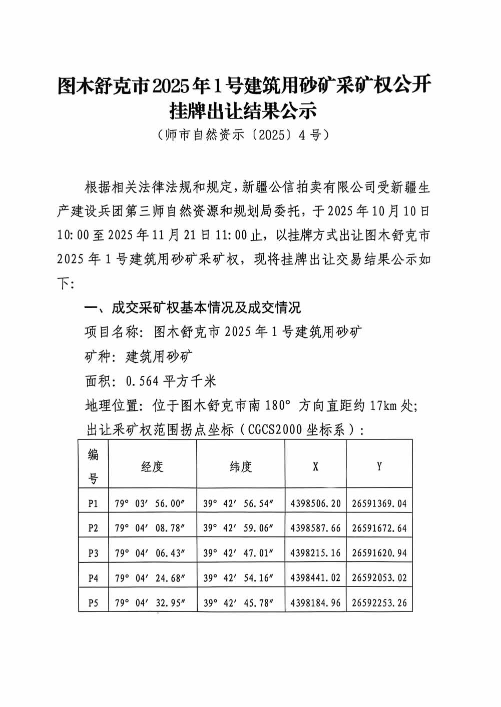 图木舒克市2025年1号建筑用砂矿采矿权公开挂牌出让结果公示