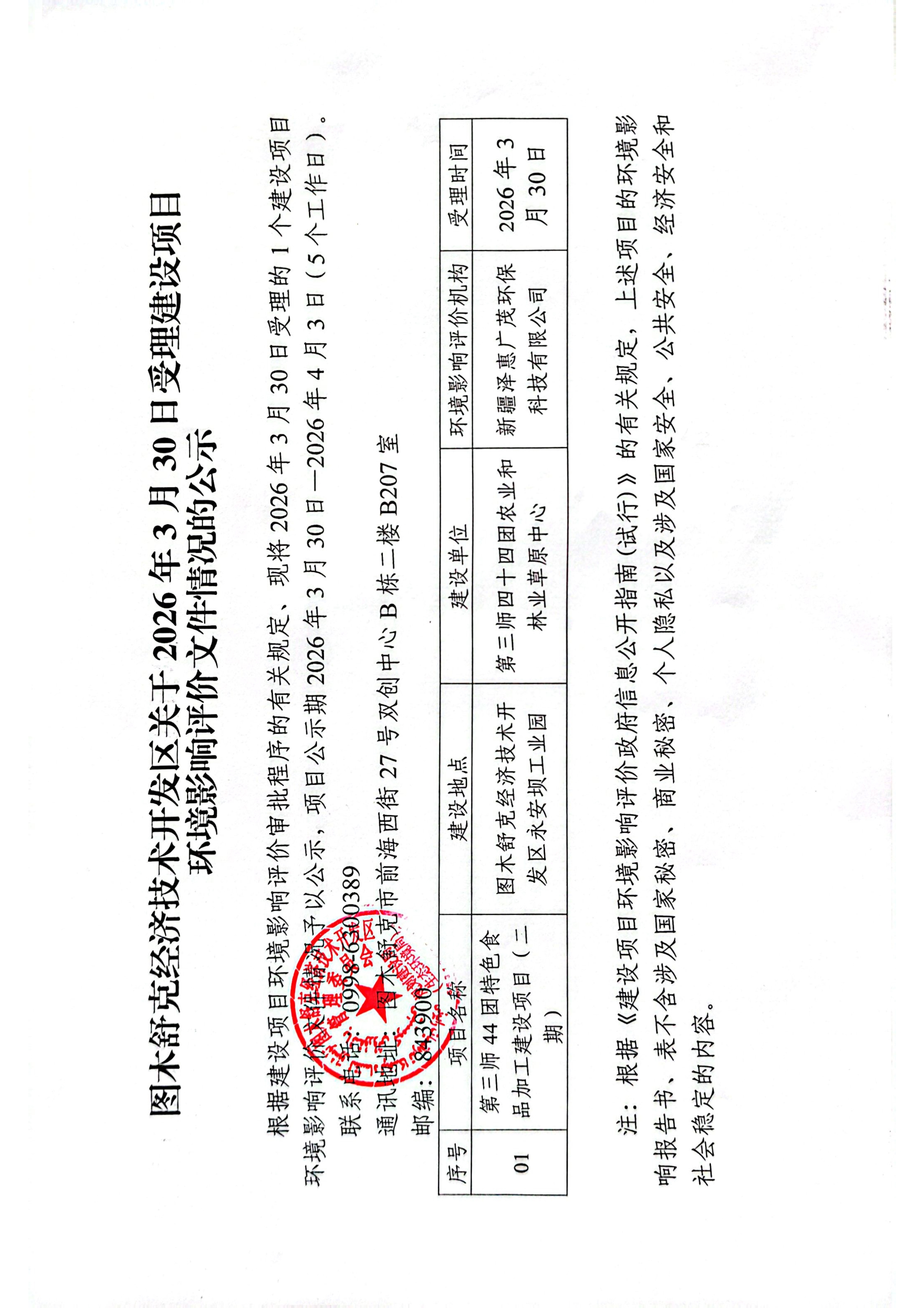 图木舒克经济技术开发区关于2026年3月30日受理建设项目环境影响评价文件情况的公示