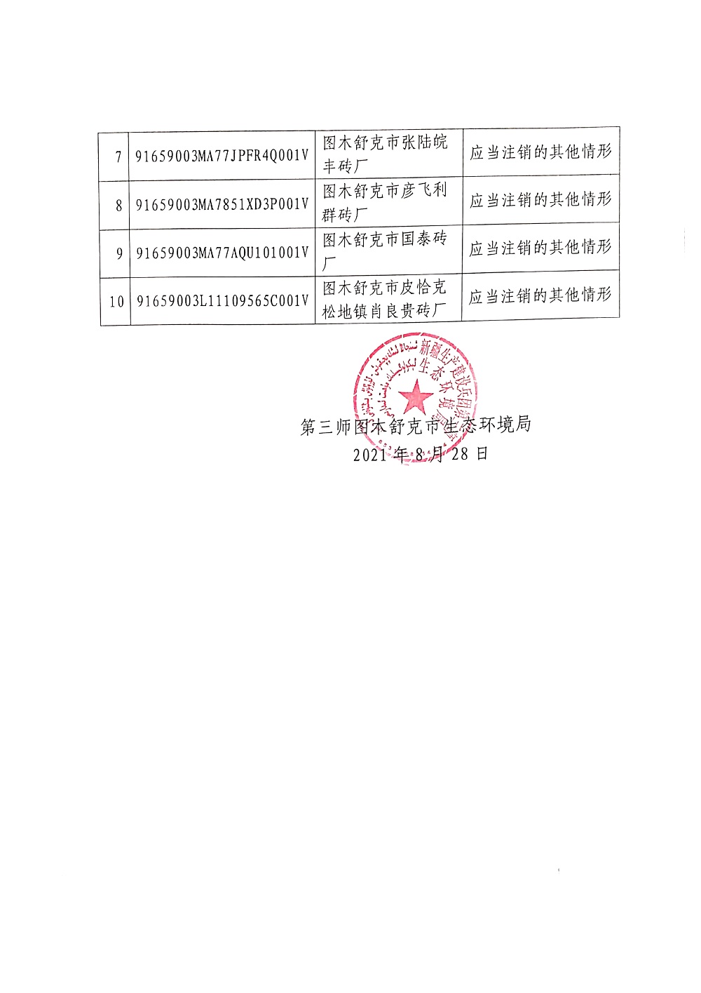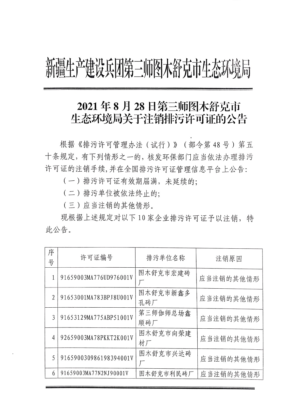 第三师图木舒克市生态环境局关于注销排污许可证的公告
